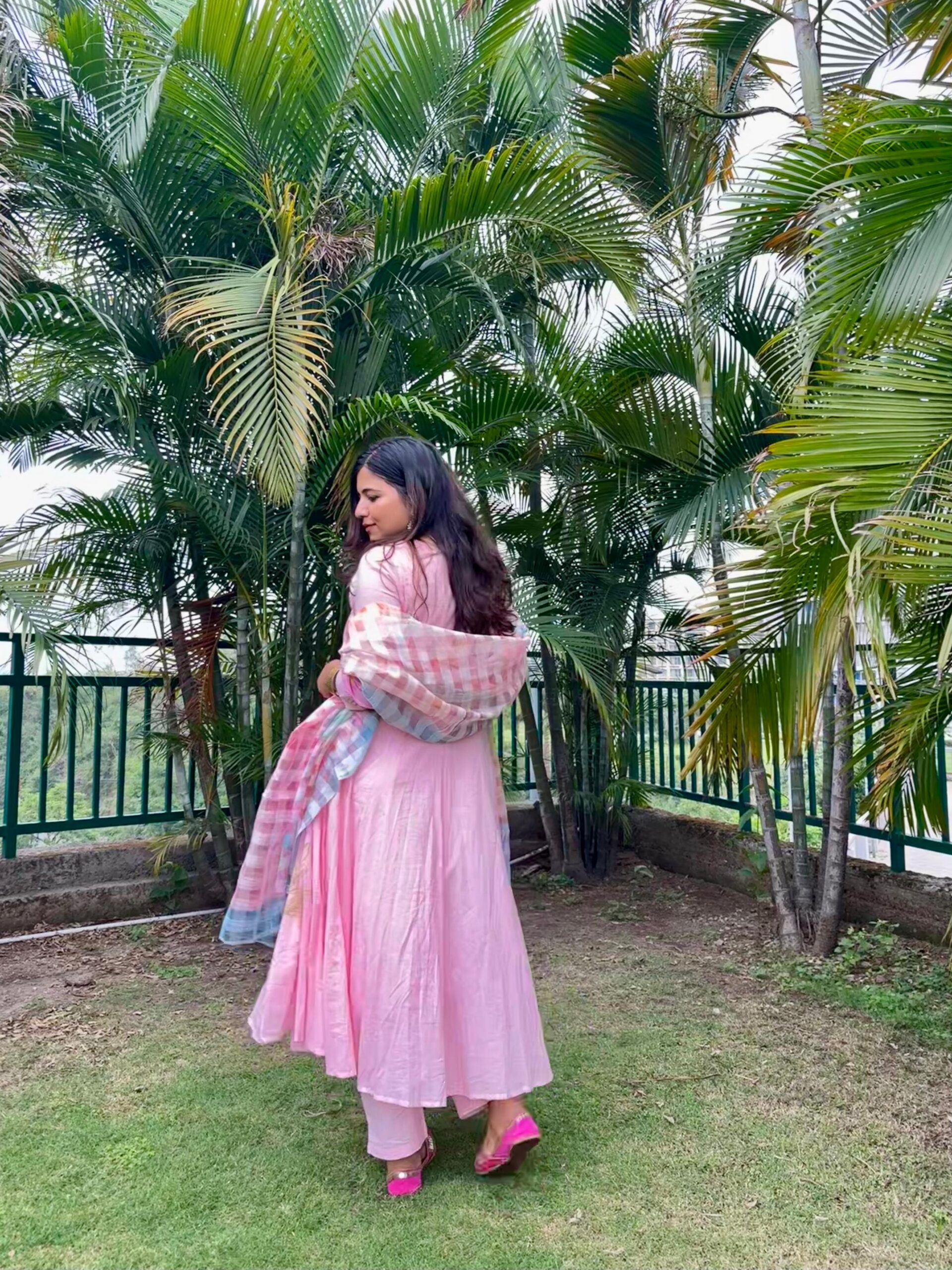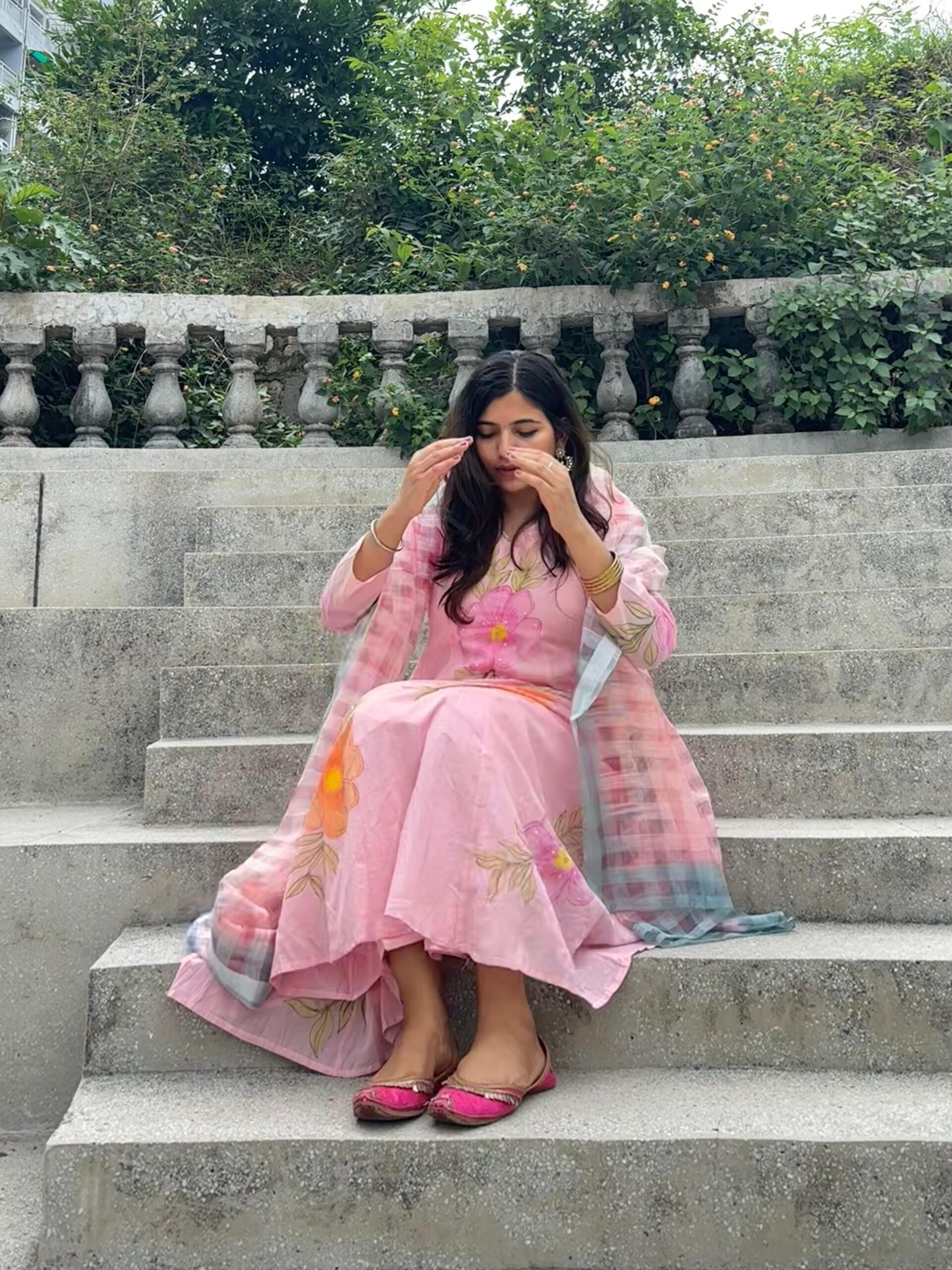 The dress is a soft pastel pink kurta with a V-neckline, adorned with large, colorful floral prints in shades of orange, pink, and green. It is paired with straight pink pants and a pastel checked dupatta featuring soft tones like blue, pink, and white. The outfit is completed with sparkly open-toe heels decorated with bows, adding a touch of glam. The overall look is fresh, elegant, and perfect for festive or casual daytime occasions.