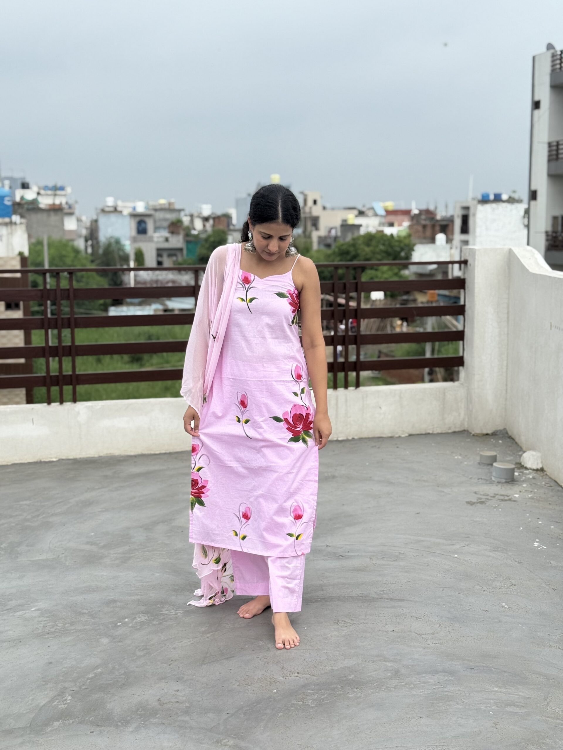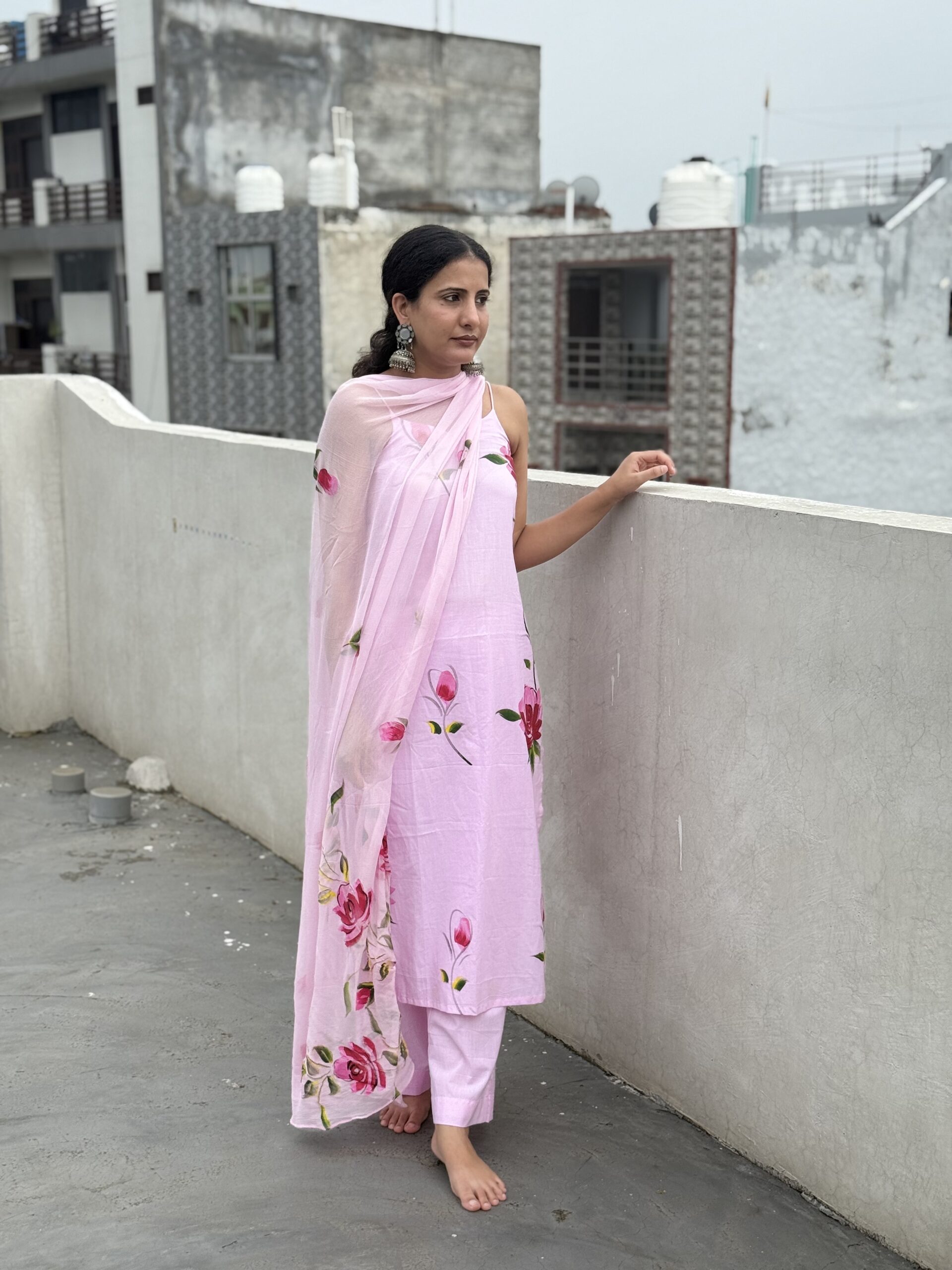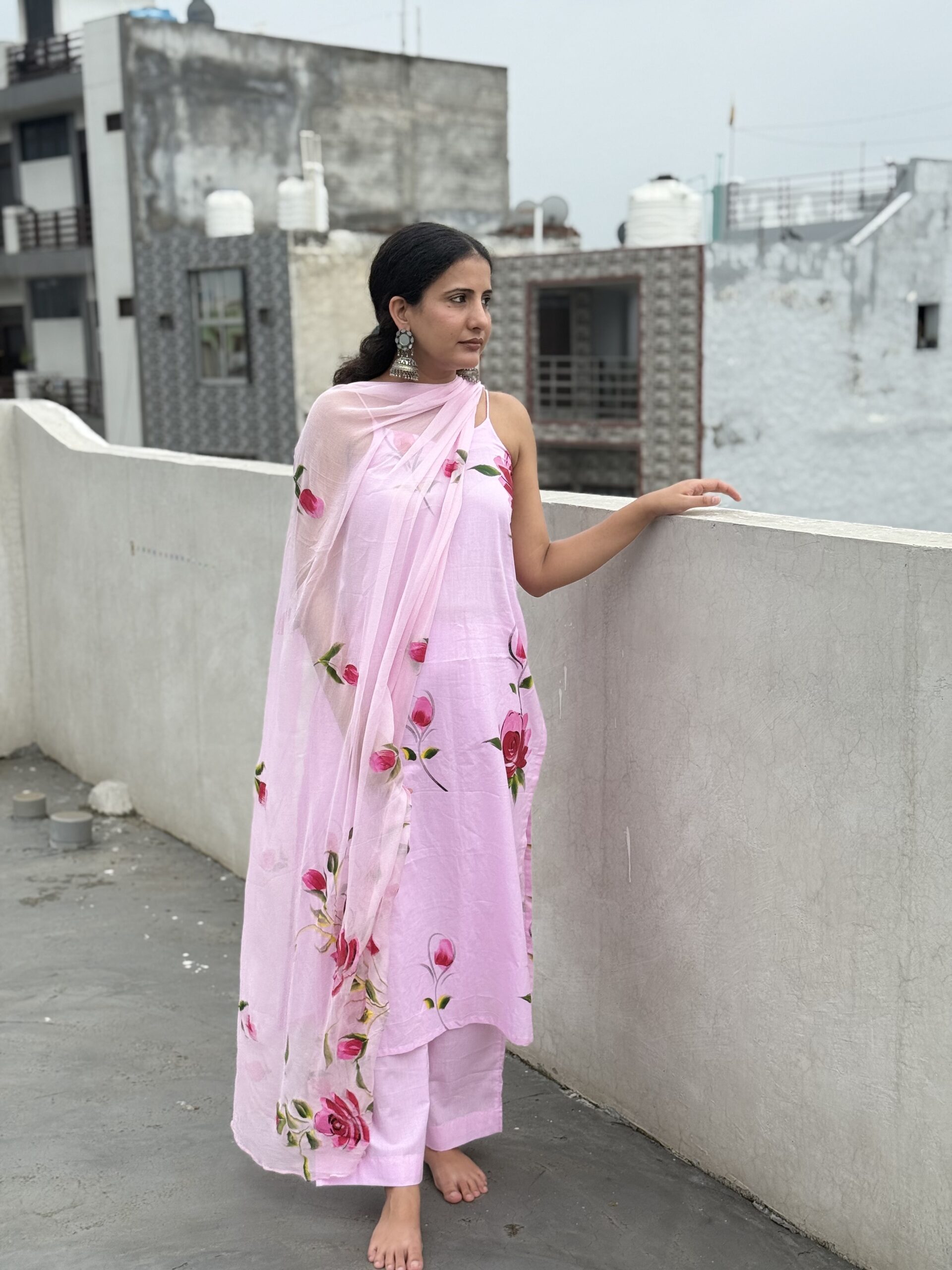 Step into elegance with this soft blush pink noodle-strap suit, adorned with hand-painted-style bold rose blooms.  Perfect for sunny brunches, casual outings, or an easy-breezy festive look, this cotton set is designed for comfort without compromising on style. Paired with matching pants and a light dupatta, it’s your go-to outfit for that graceful yet effortless vibe.