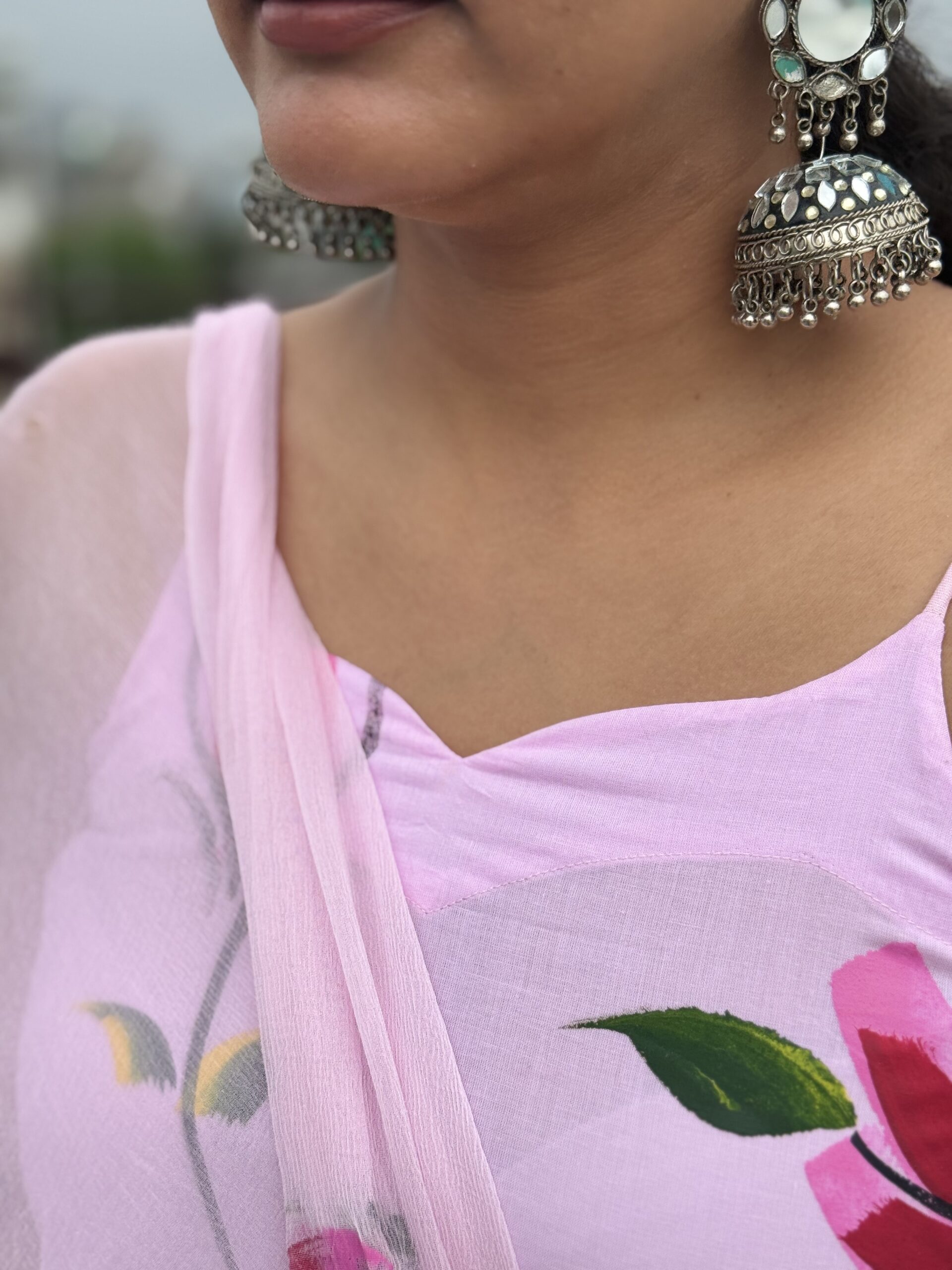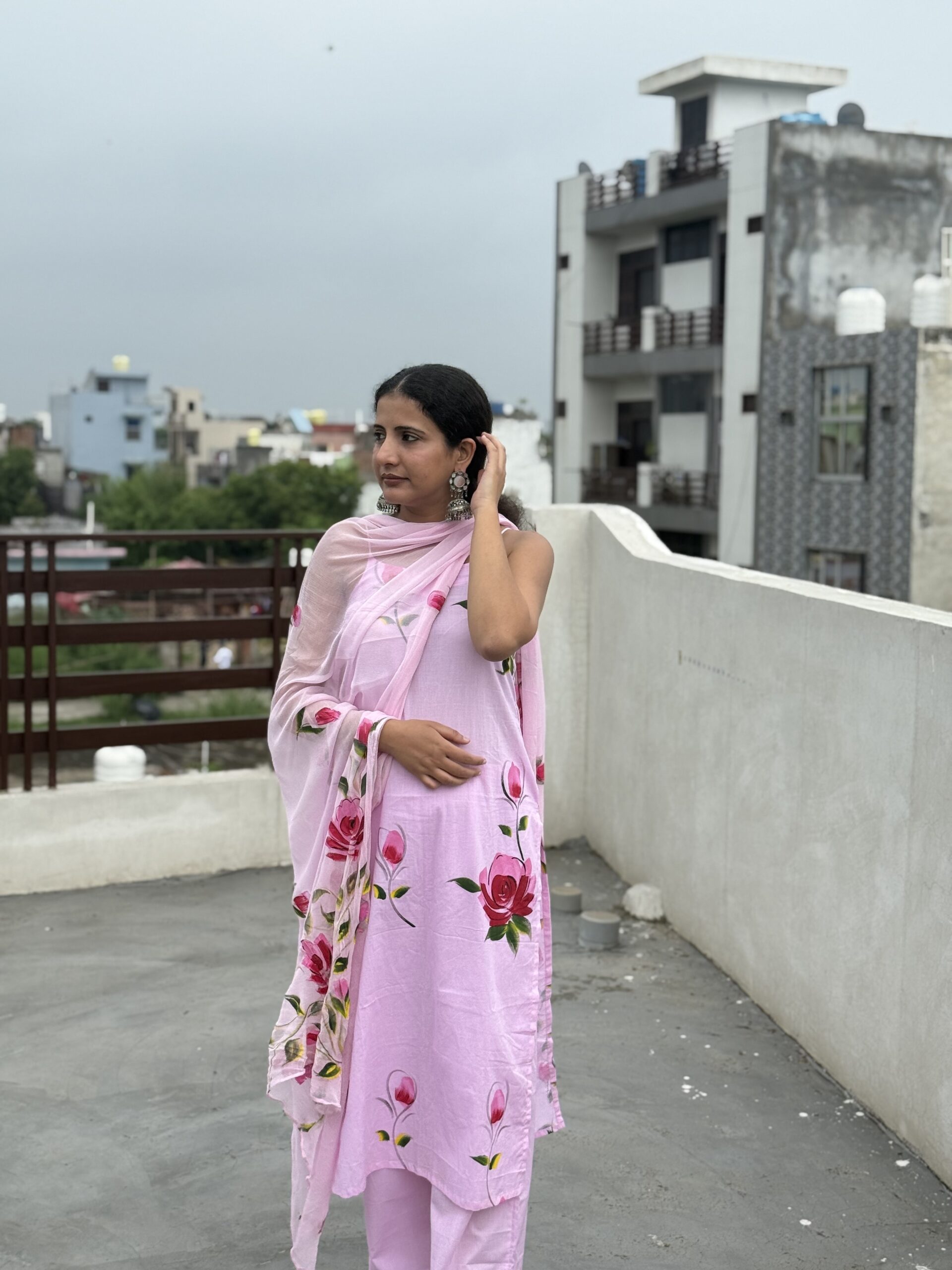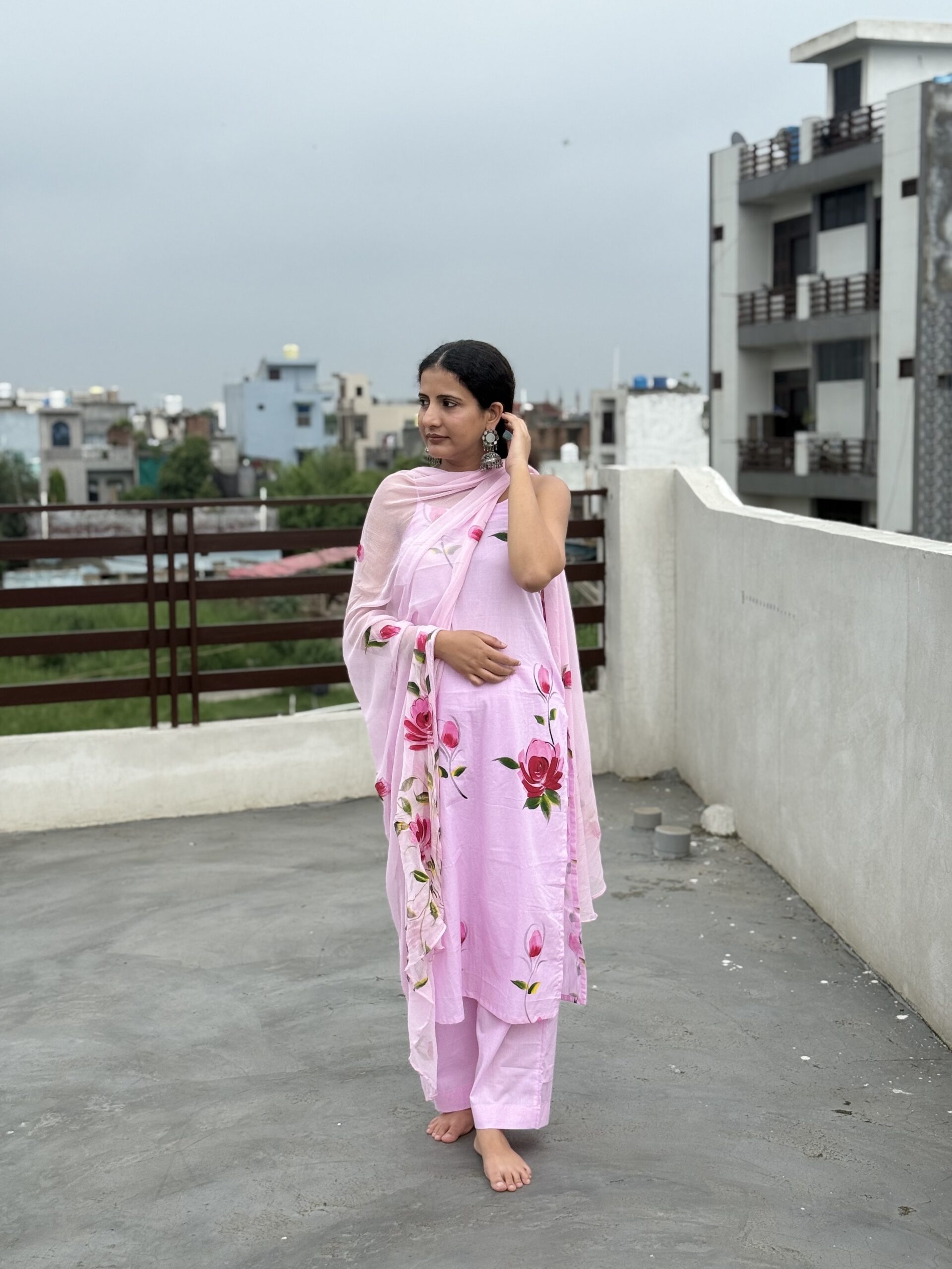 Step into elegance with this soft blush pink noodle-strap suit, adorned with hand-painted-style bold rose blooms.  Perfect for sunny brunches, casual outings, or an easy-breezy festive look, this cotton set is designed for comfort without compromising on style. Paired with matching pants and a light dupatta, it’s your go-to outfit for that graceful yet effortless vibe.