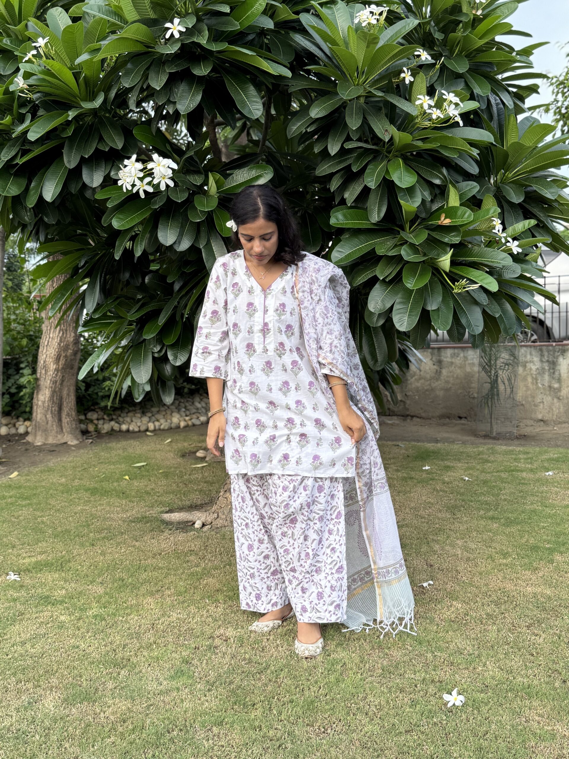 Step into serene elegance with this handblock-printed lilac and white cotton suit – a perfect blend of comfort, charm, and everyday beauty.